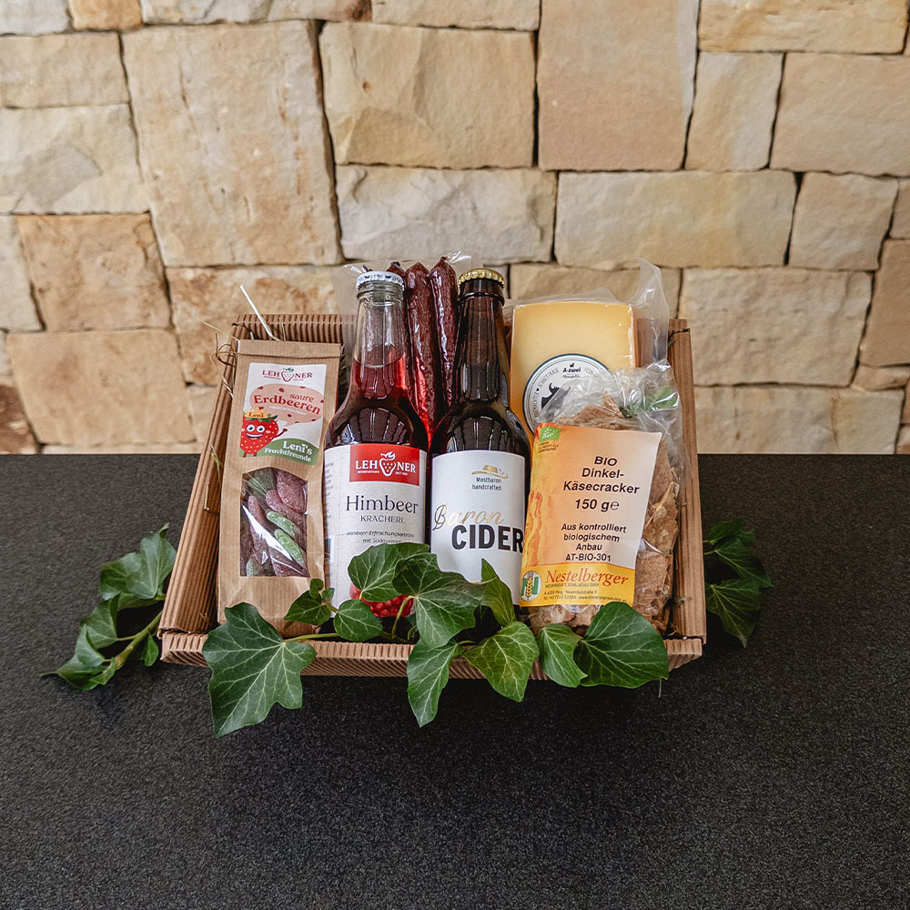 Der Geschenkkorb Jausen Jakob bringt die herzhafte Seite der Region auf den Tisch. Mit einer Kombination aus süßen Knabbereien, deftigen Klassikern und erfrischendem Cider ist er der ideale Begleiter für jede Jause.
